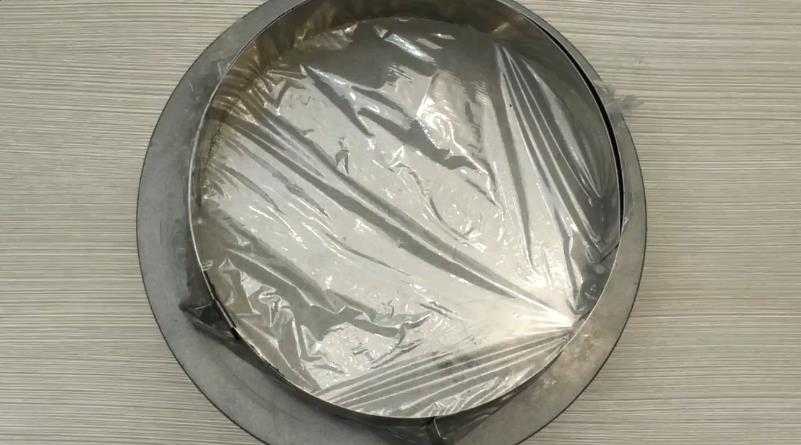 Положить на твердую поверхность кулинарное кольцо с пленкой.