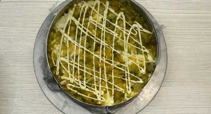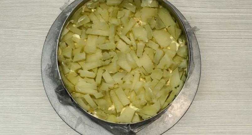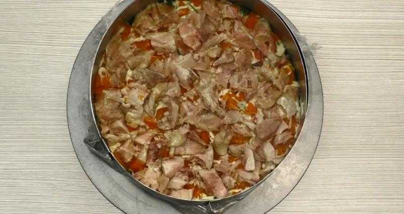 Я сегодня в своем пошаговом фото рецепте использую прямоугольную форму без дна. Устанавливаю ее на тарелку и заполняю первым слоем из кусочков курицы. Куриная грудка достаточно суховата, поэтому на нее нужно будет нанести слой майонеза. Мясо с бедрышек более сочное и нежное, соуса для этого слоя потребуется совсем немного. Майонезную сеточку можно нанести из конвертика или пакетика со срезанным уголком.