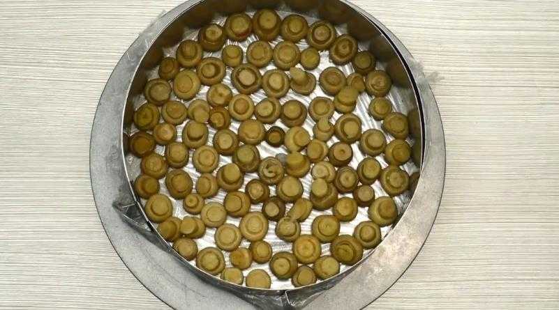 Вторым слоем идут жареные с луком грибы. Майонезная сеточка – по желанию.