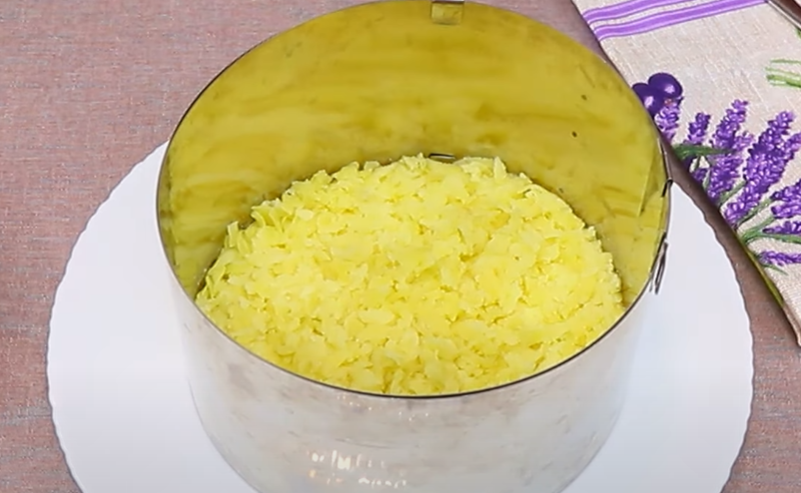 3.Для сборки используйте кольцо, так получается красиво и эстетично. Можно все делать и просто в глубоком прозрачном салатнике. Тут уже думайте сами, решайте сами. Первым слоем выложите картошку, разровняйте ее вилкой.