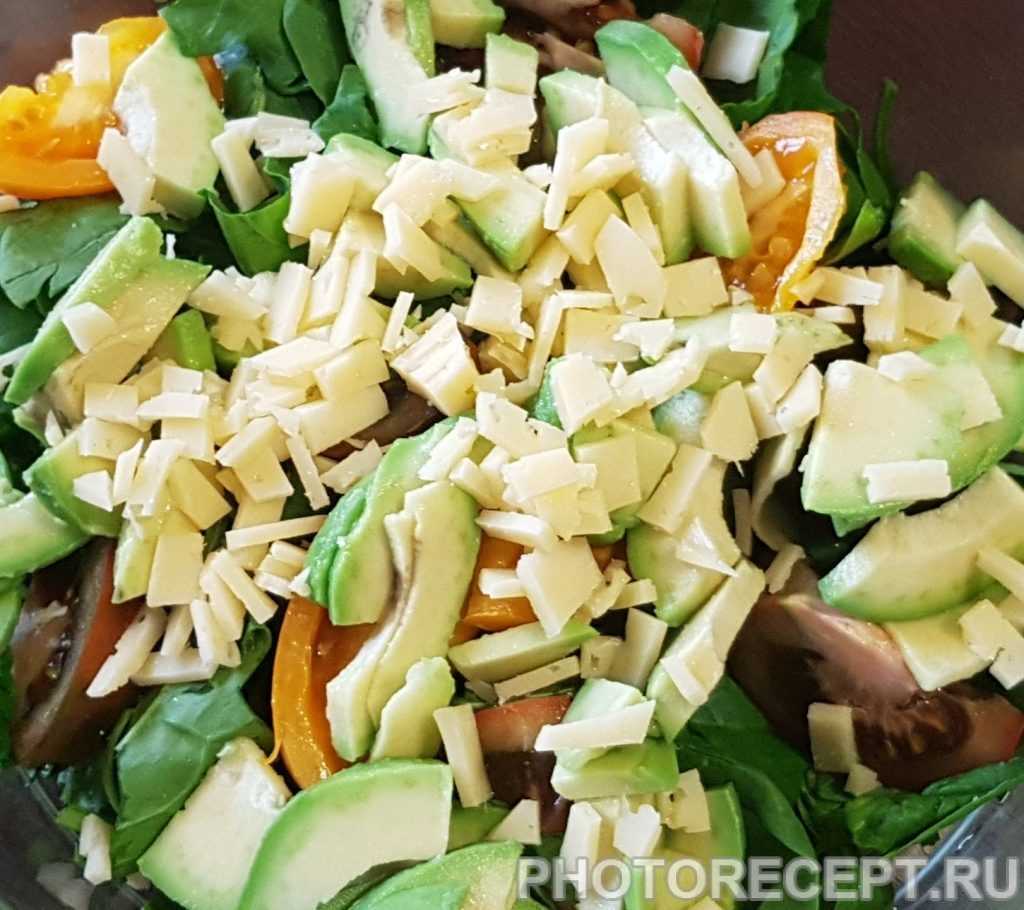 Авокадо очистите от кожуры, извлеките косточку и нарежьте небольшими кусочками. Добавьте авокадо к салату.