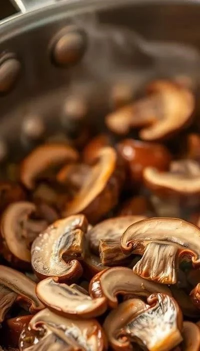 - Добавить шампиньоны к луку и обжаривать до готовности, пока не испарится вся жидкость.
