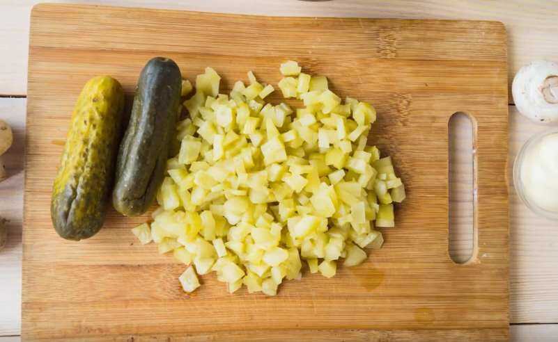 С огурцами мы поступим аналогично. Желательно использовать овощ малосолёный, в противном случае это сильно отразится на вкусовых качествах нашей закуски.