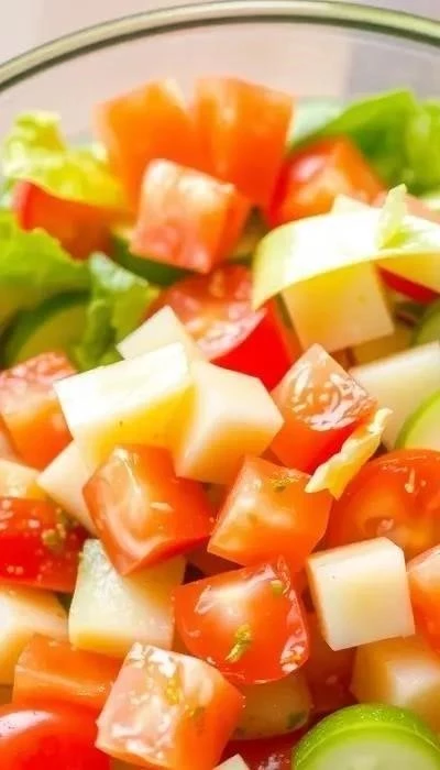 Ингредиенты: айсберг, помидоры, огурцы, оливковое масло, уксус, соль, перец.