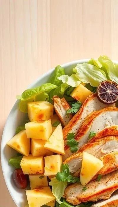 Ингредиенты: айсберг, куриное филе, консервированные ананасы, майонез, соль, перец.