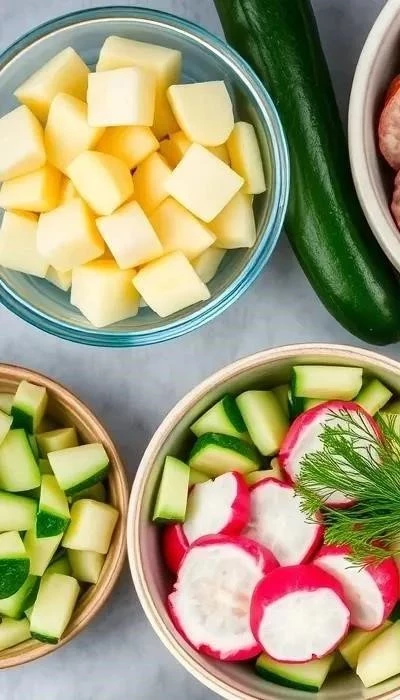 Шаг 1: В большой миске или кастрюле соедините нарезанные картофель, яйца, колбасу, огурцы и редис.