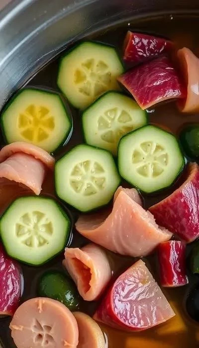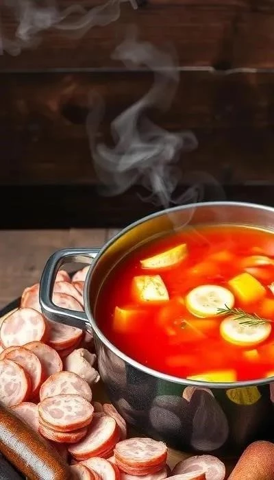 - Добавление копченостей: Добавить в бульон обжаренный лук с томатной пастой, копчености и соленые огурцы. Варить 15-20 минут.