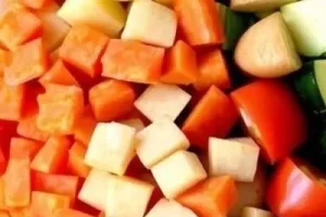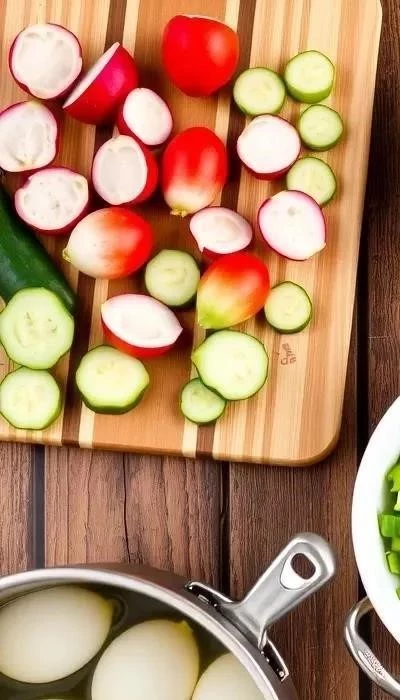 - Нарезка овощей: Огурцы, редис и картофель нарежьте небольшими кубиками.