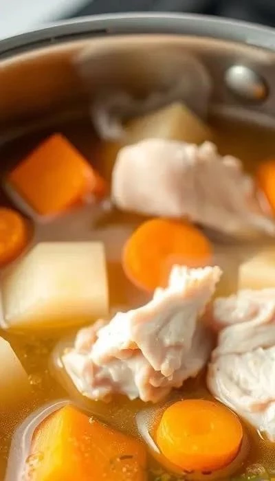 - Добавление овощей и картофеля: Выньте курицу из бульона и отделите мясо от костей. Верните бульон на огонь, добавьте картофель и варите 10-15 минут.