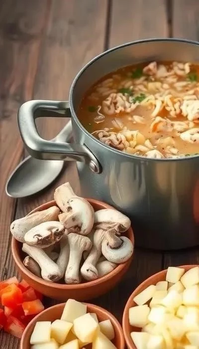 - Суп с грибами: Добавьте обжаренные грибы (шампиньоны, вешенки) в суп вместе с рисом.