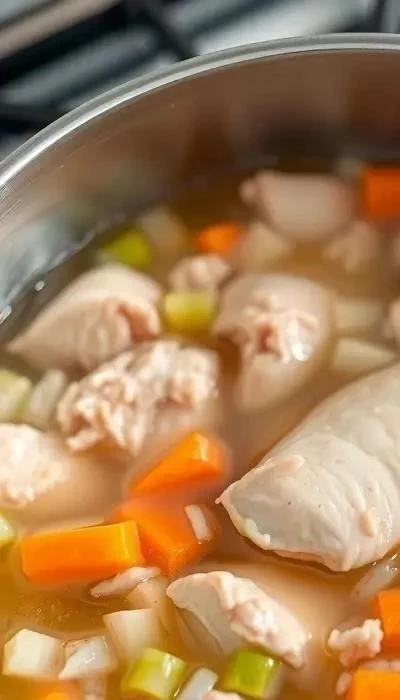 - Добавляем овощи: Когда курица будет готова, добавьте в бульон картофель и морковь. Варите около 10-15 минут, пока картофель не станет мягким.