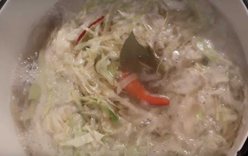 5. Нашинкуйте капусту и добавьте ее в суп. Когда суп закипит, положите лавровый лист и острый перец.