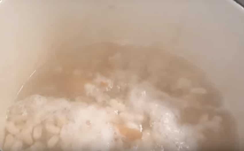 Затем, необходимо промытую и замоченную заранее фасоль отправить вариться в кастрюлю с мясом. Если не удалось замочить ее заранее — не расстраиавайтесь. Просто помните, что по времени, такая фасоль будет варится дольше.