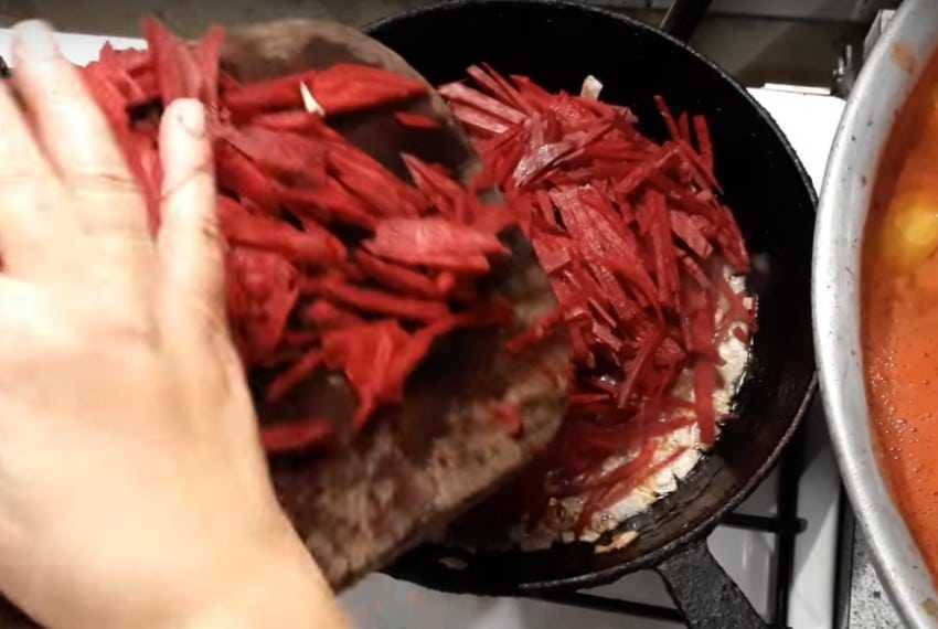 - Свеклу очистите, нарежьте соломкой и пассируйте в растительном масле, чтобы она быстрее сварилась.
