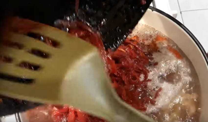 Пока томаты с чесноком жарятся, мелко нашинкуйте капусту и болгарский перец и добавьте их в борщ.