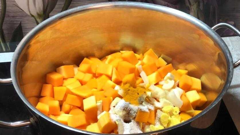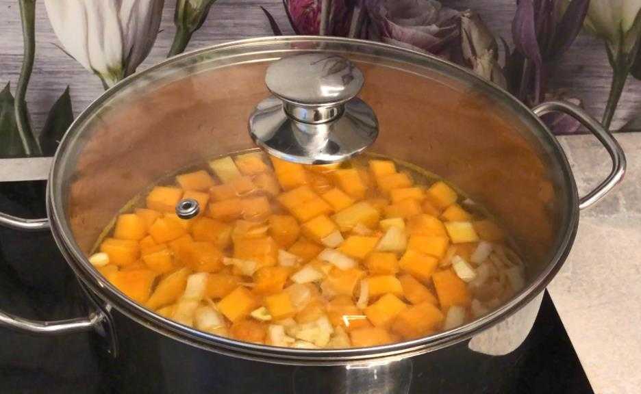 - Тыквенную мякоть нарезать произвольными ломтиками. В подсоленной воде (500 мл.) отварить курятину под крышкой полчаса.