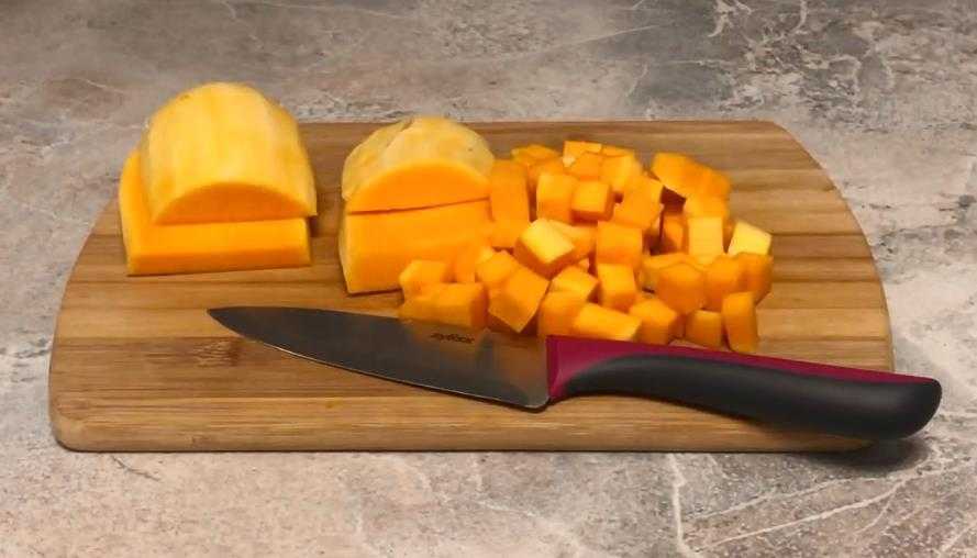 Тыкву разделить пополам, удалить столовой ложкой семена. Очистить овощ от кожуры, нарезать сантиметровыми кубиками.