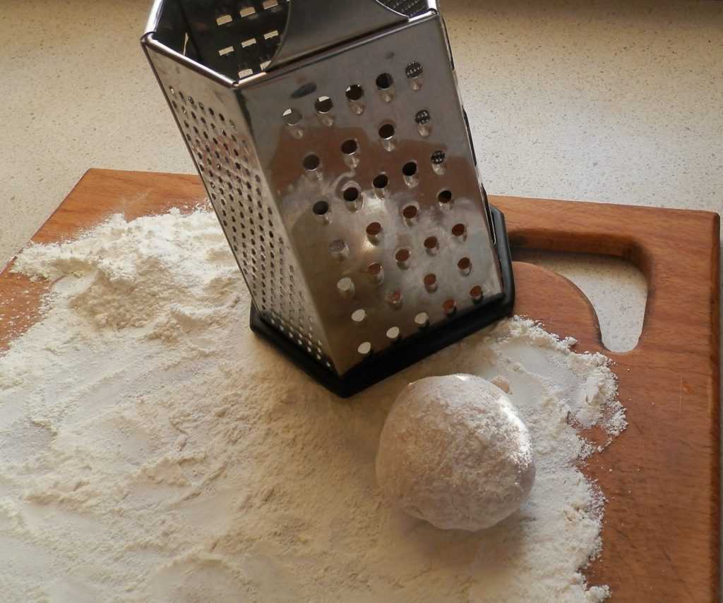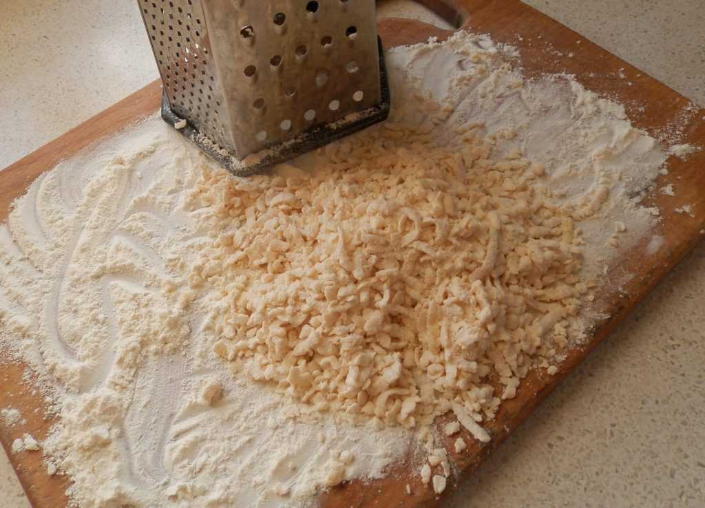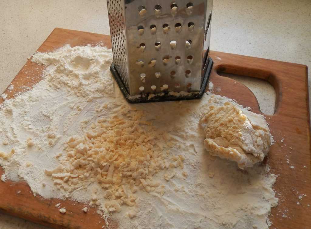 5. Взять терку, натереть тесто, периодически обмакивая его в муку. Тогда оно лучше будет натираться.