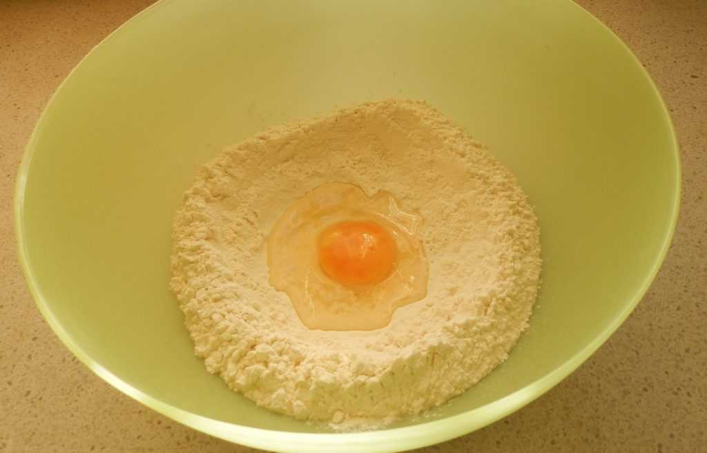 2. Разбить туда яйцо, подсолить.3. Замесить очень крутое (!) тесто, слепить из него круглый шарик.