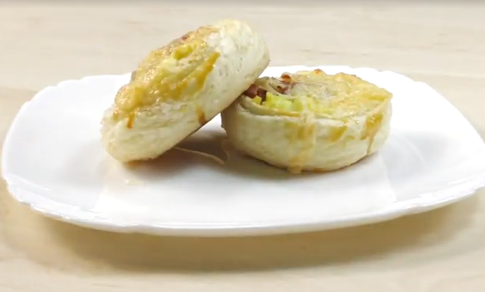 - Закрутите тесто в рулет. Нарежьте фрагментами. Уложите на противень, смазанный маслом. Смажьте яйцом. Запеките рулетики в хорошо разогретой духовке при 200℃. Времени понадобится 15 минут.