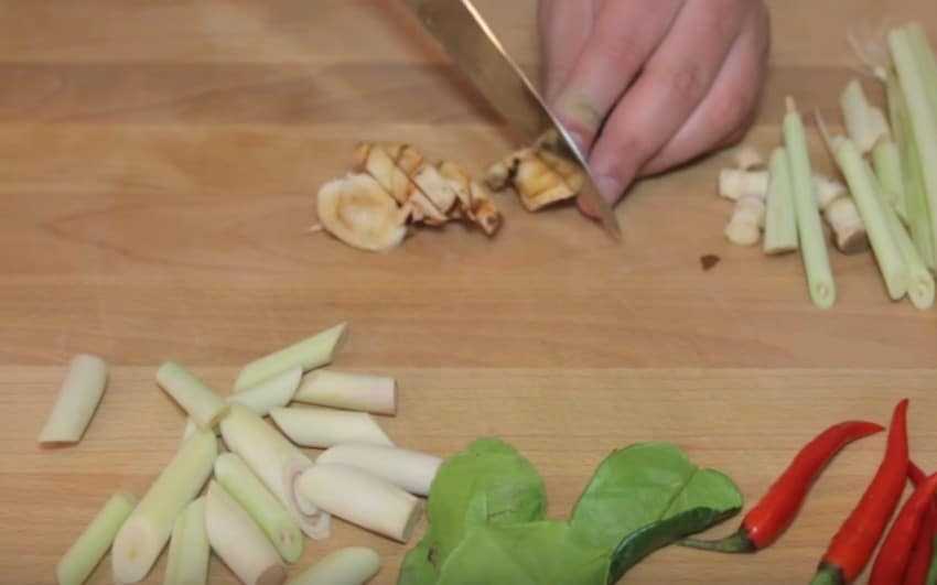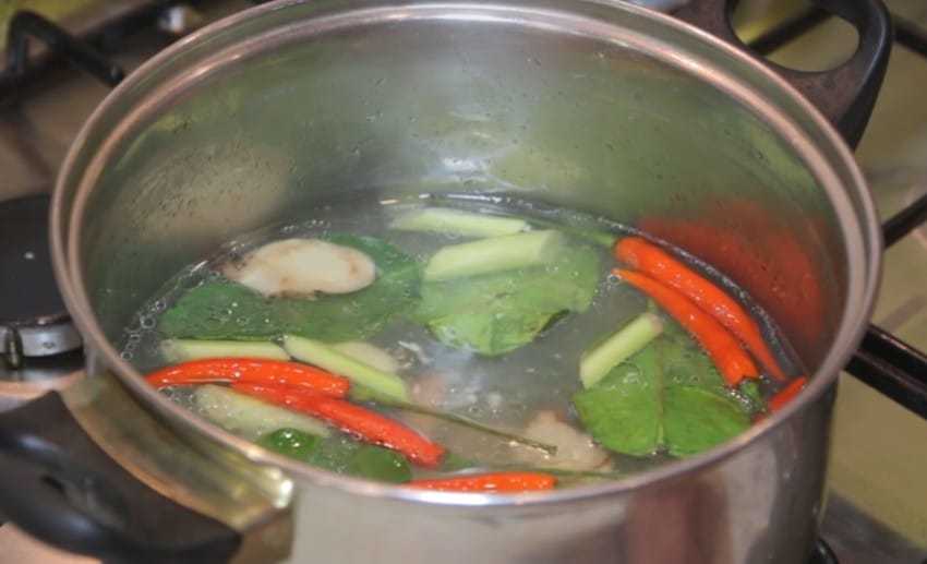 6. Бульон поставьте на огонь, закипятите, отправьте туда корень галангала, лемонграсс, листья лайма и перец чили. Последний ингредиент лучше добавлять частями, чтобы не получилось слишком остро. Варите все вместе 5 минут на среднем огне.