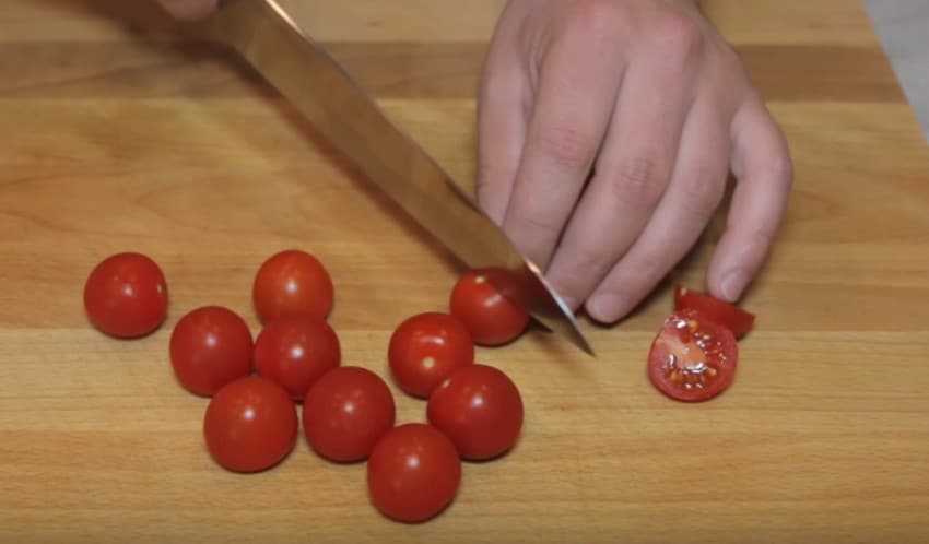 5. Вешенки нарежьте достаточно крупными кусочками, а жесткие ножки обязательно отрежьте. Помидоры черри помойте и разрежьте пополам.