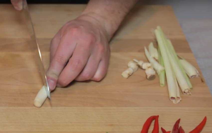 2. Листья лайма слегка разомните руками. Лемонграсс очистите от верхнего слоя и верхних жестких частей, нарежьте средними кусочками.
