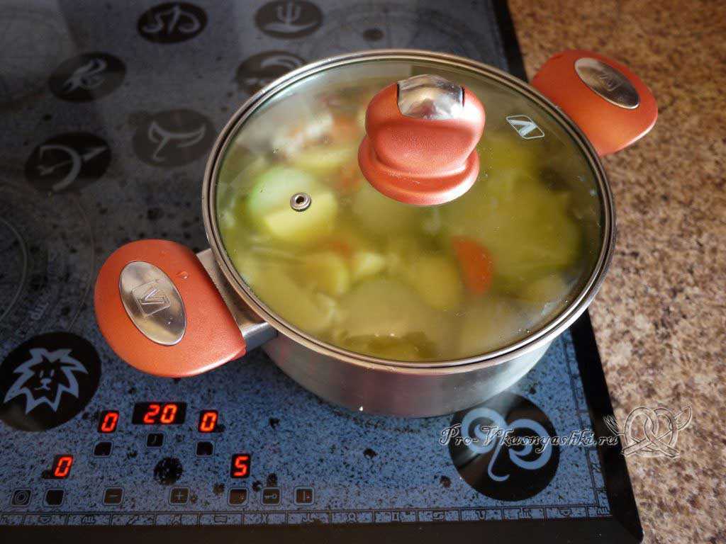 Накрываем посуду крышкой, дожидаемся кипения при максимальной мощности нагрева, затем убавляем огонь до среднего и варим около 20 мин до готовности картофеля (овощ должен стать мягким).