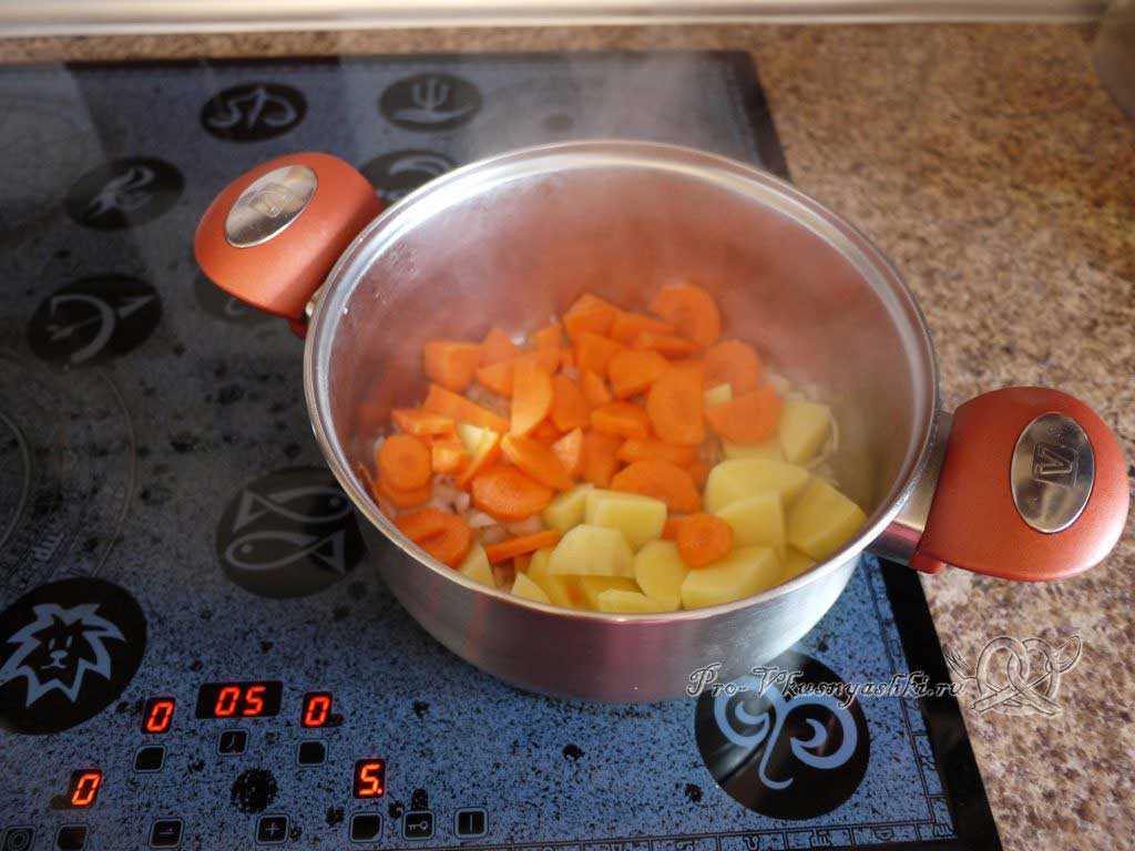 Затем добавляем морковь, обжариваем 5-7 мин.