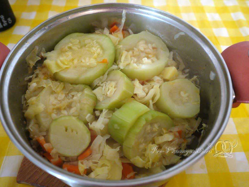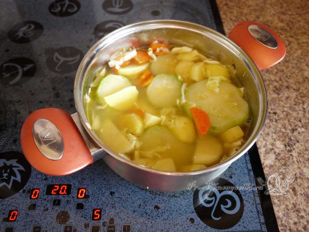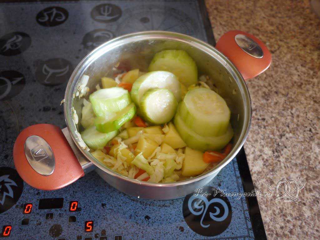 В последнюю очередь отправляем в кастрюлю крупно нарезанные кабачки.