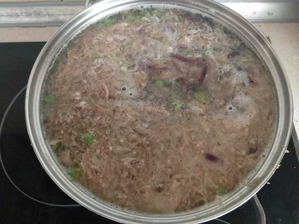 Свинина с косточкой помещается в кастрюлю, заливается 3,5-4 л воды, и готовится бульон около часа с лавровым листом и душистым горошком.