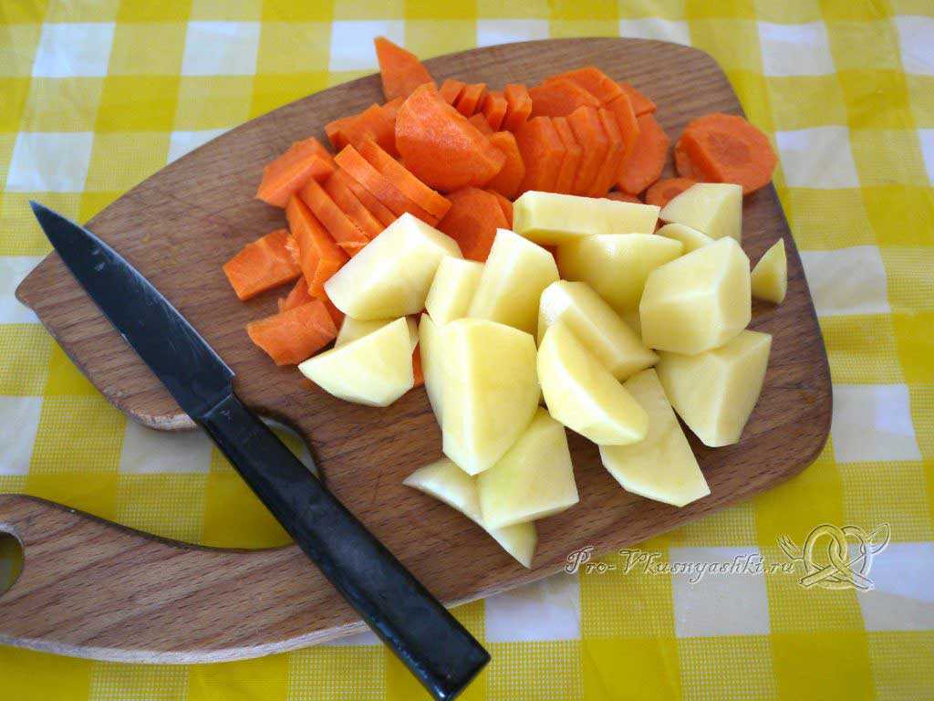 Сразу же нарезаем морковь и картофель небольшими ломтиками.