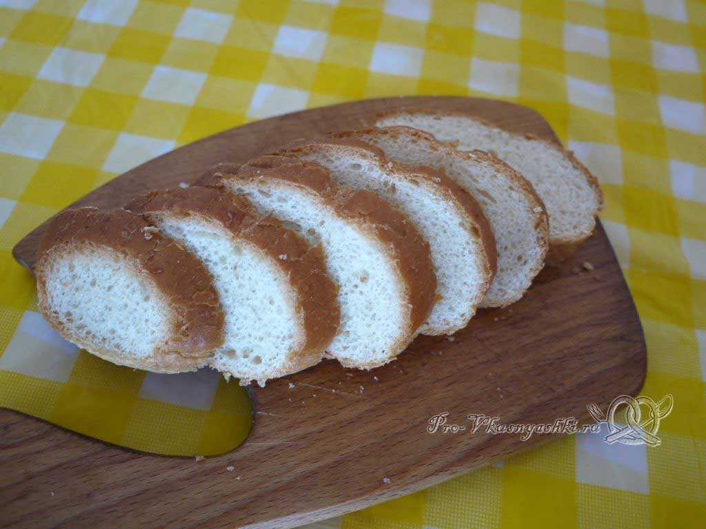 Не теряя времени, сделаем гренки. Для этого хлеб нарезаем на части толщиной около 5-7 мм.