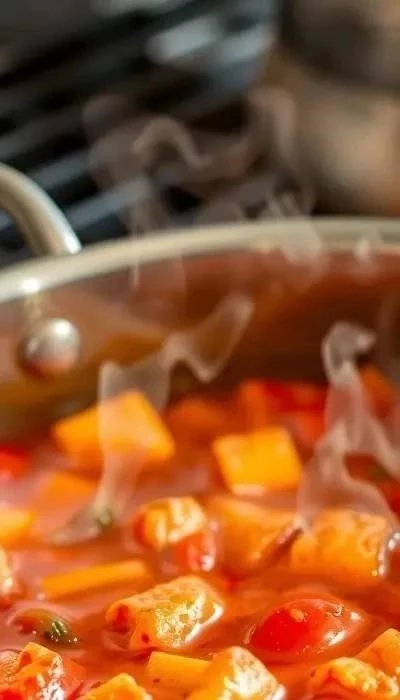 - Тушим лечо: Уменьшите огонь до минимума и тушите лечо под крышкой около 40-60 минут, периодически помешивая, чтобы не пригорело.