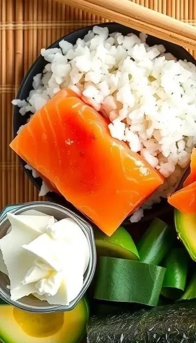 - Подготовка ингредиентов: Нарежьте лосось, огурец и авокадо тонкими полосками.