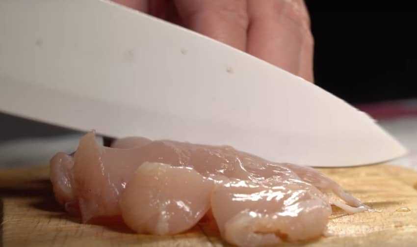 2. Курицу промойте, просушите бумажным полотенцем. Порежьте на кубики или просто на кусочки среднего размера.