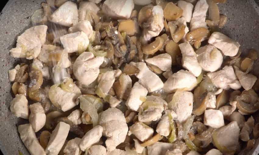 4. Добавьте грибы, жарьте 10 минут на среднем огне. После, выложите в сковороду мясо, посолите, поперчите, добавьте приправ. Жарьте до полуготовности около 7 минут.
