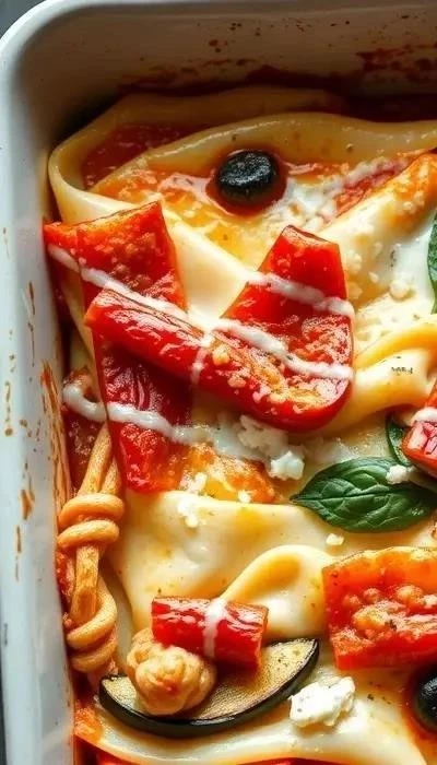 - Повторите слои: листы лазаньи, овощная начинка, рикотта, соус бешамель.