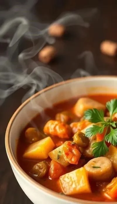 Подавайте овощной гуляш с фасолью горячим, украсив свежей зеленью (петрушкой, укропом). Он прекрасно сочетается с картофельным пюре, гречкой, рисом или просто с кусочком свежего хлеба. Для более пикантного вкуса можно добавить ложку сметаны или йогурта.