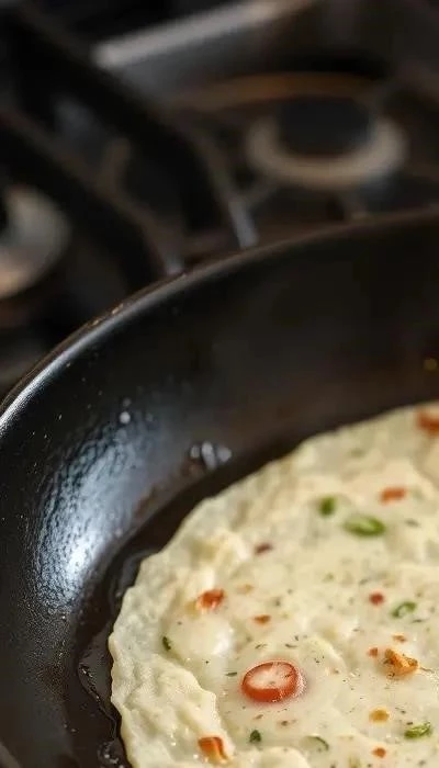 - Налейте на сковороду небольшое количество теста (примерно 1/4 стакана) и равномерно распределите его по всей поверхности.