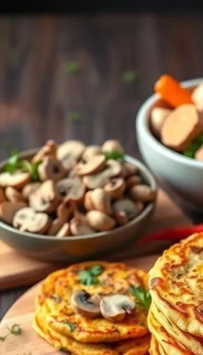 Подавайте овощные блины с грибами горячими. Украсьте их свежей зеленью, сметаной или йогуртом. В качестве соуса можно использовать сметанный соус с чесноком и зеленью, томатный соус или грибной соус.