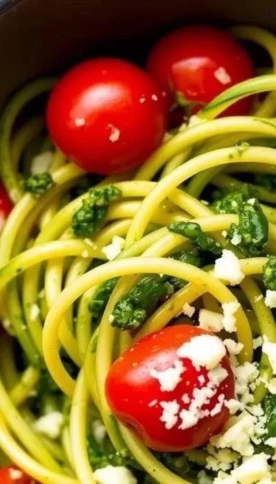 - Добавьте песто соус к овощным спагетти и тщательно перемешайте.