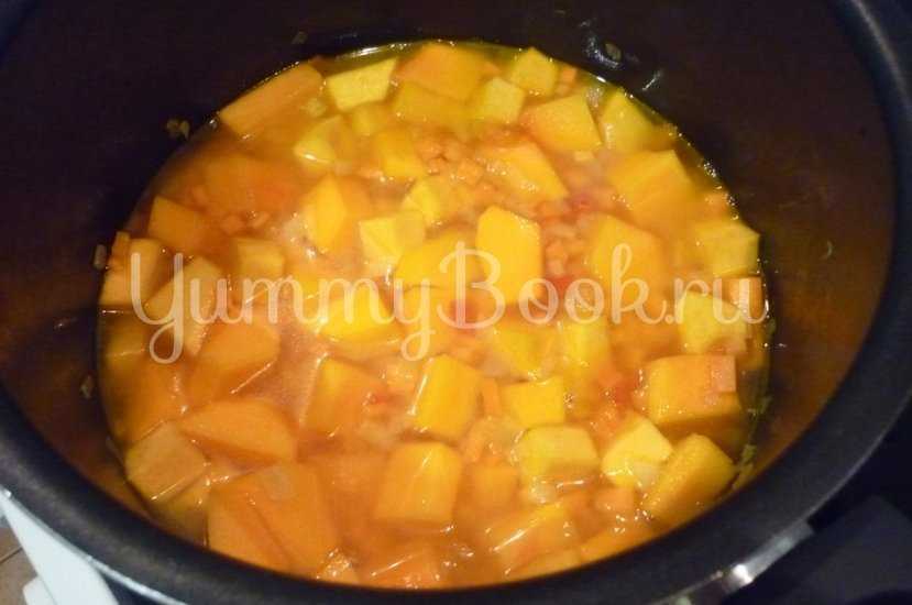 11. Добавляем соль, все специи и чеснок. Варим «а-ля зирвак» минут 15. Тыква за это время должна стать мягкой, но не превратиться в кашу.