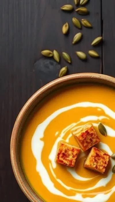 Подавайте тыквенный крем-суп горячим, украсив его хрустящими гренками и свежей зеленью. Можно добавить немного тыквенных семечек или капельку оливкового масла. Для более эффектной подачи можно использовать красивые тарелки и украсить суп веточкой розмарина или тимьяна.